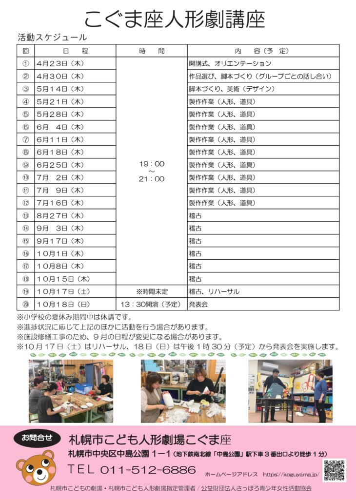 作品選びから脚本、人形づくりから上演までを実践する全18回の講座で、講座の最終回ではこぐま座で発表会を行います。