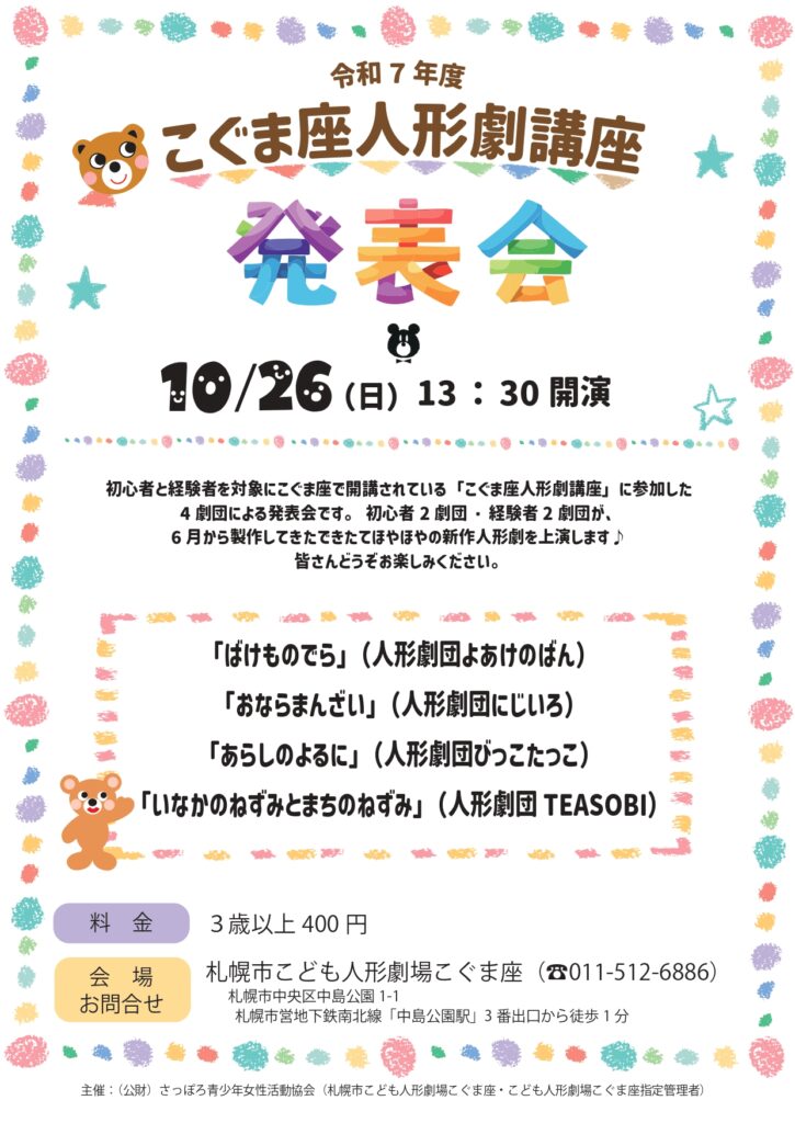 初心者・経験者を対象に行っている人形劇講座の発表会です。4劇団が6月から製作してきた作品を初披露します。各劇団の個性が光る、できたてほやほやの新作4作品をお楽しみください♪