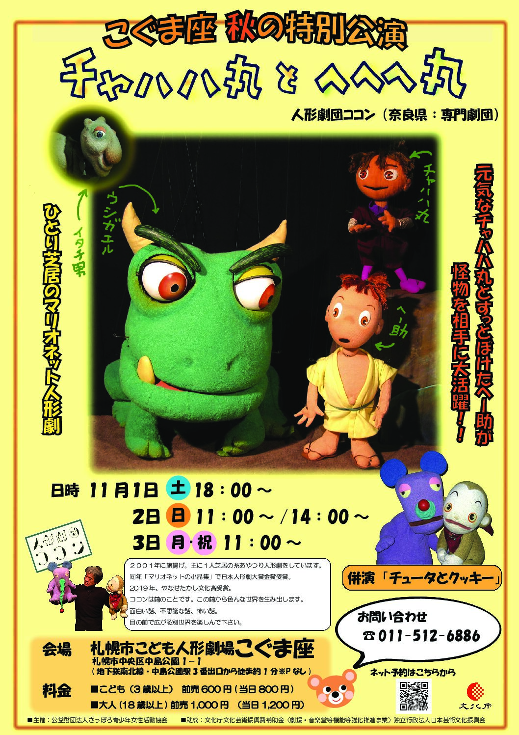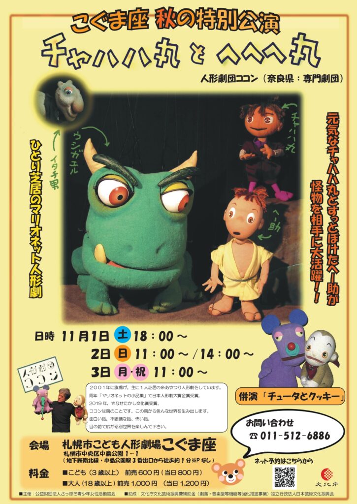 ≪こぐま座秋の特別公演≫人形劇団ココン(奈良県:専門劇団)人形劇「チャハハ丸とヘヘヘ丸」腹話術「チュータとクッキー」