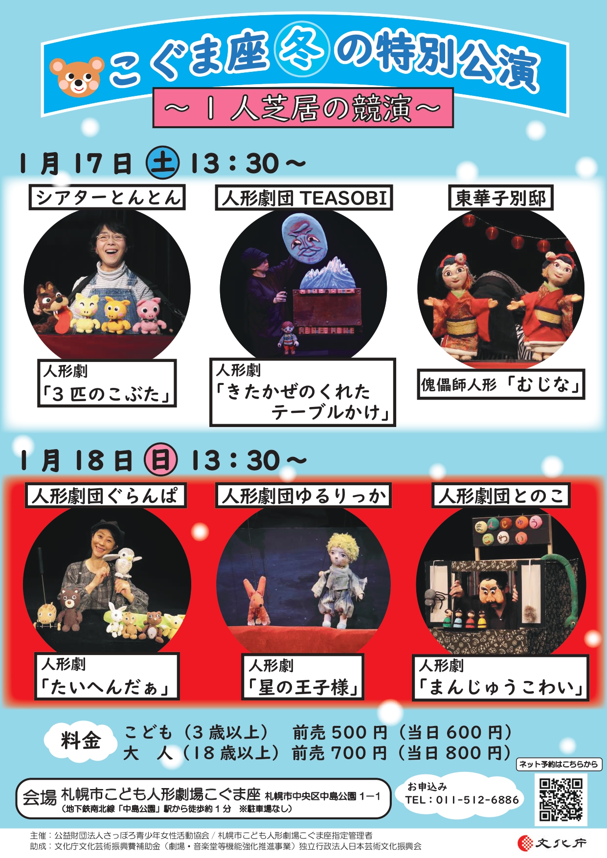【日時】1月17日(土)13:30~1月18日(日)13:30~※開演30分前開場 【上演団体・演目】17日(日)「3匹のこぶた」(シアターとんとん)「きたかぜのくれたテーブルかけ」(TEASOBI)「むじな」(東華子別邸) 18日(日)「 … “≪こぐま座冬の特別公演~1人芝居の競演~≫” の続きを読む