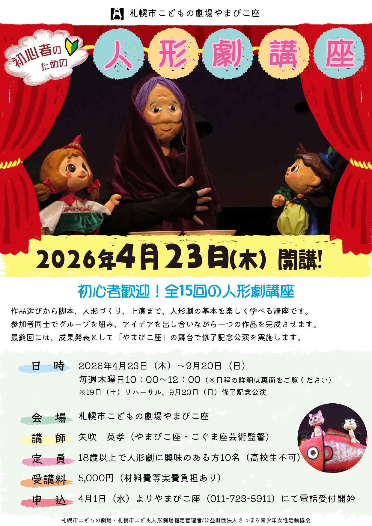 日本昔話の中でも有名な「さるかに合戦」ですが、この人形劇は、それとはちょっぴり違うさるとかにのお話です。今よりもう少し大人も子どもものどかだった頃…子どもたちは朝から晩まで外で遊び、大人たちは時には優しく、時には厳しく子どもたちを見守ってい … “≪人形劇フェスティバル2026年さっぽろ冬の祭典≫人形劇「さるとかに」&ミニコンサート” の続きを読む